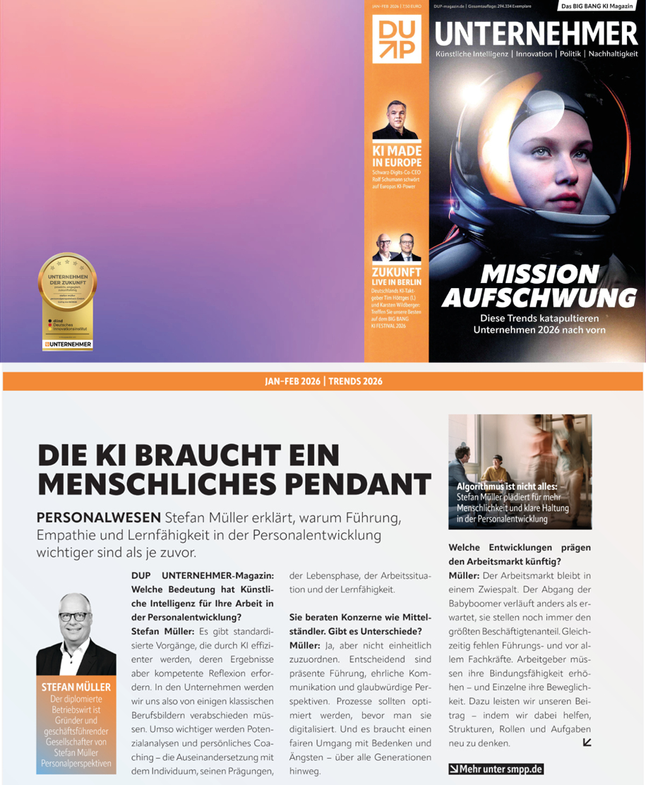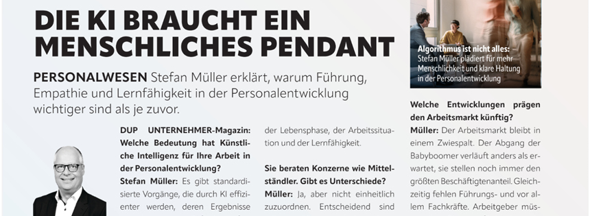 Für die neue Ausgabe des DUP Unternehmer Magazins wurde ich zum Thema KI in Bezug zu unserer Beratungspraxis interviewt. Hintergrund ist unsere Auszeichnung als „Unternehmen der Zukunft“.